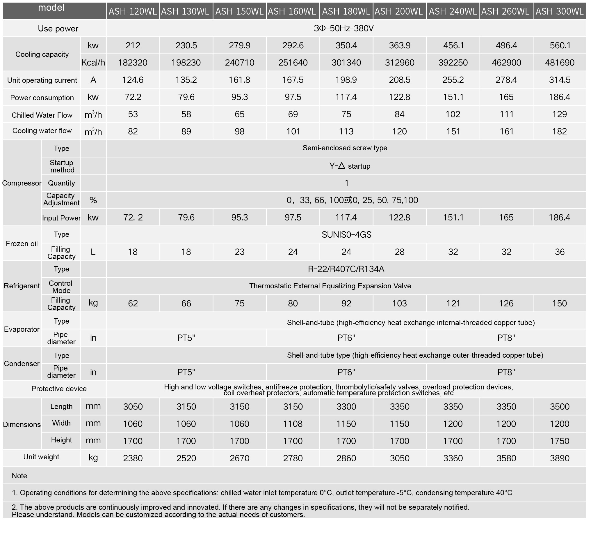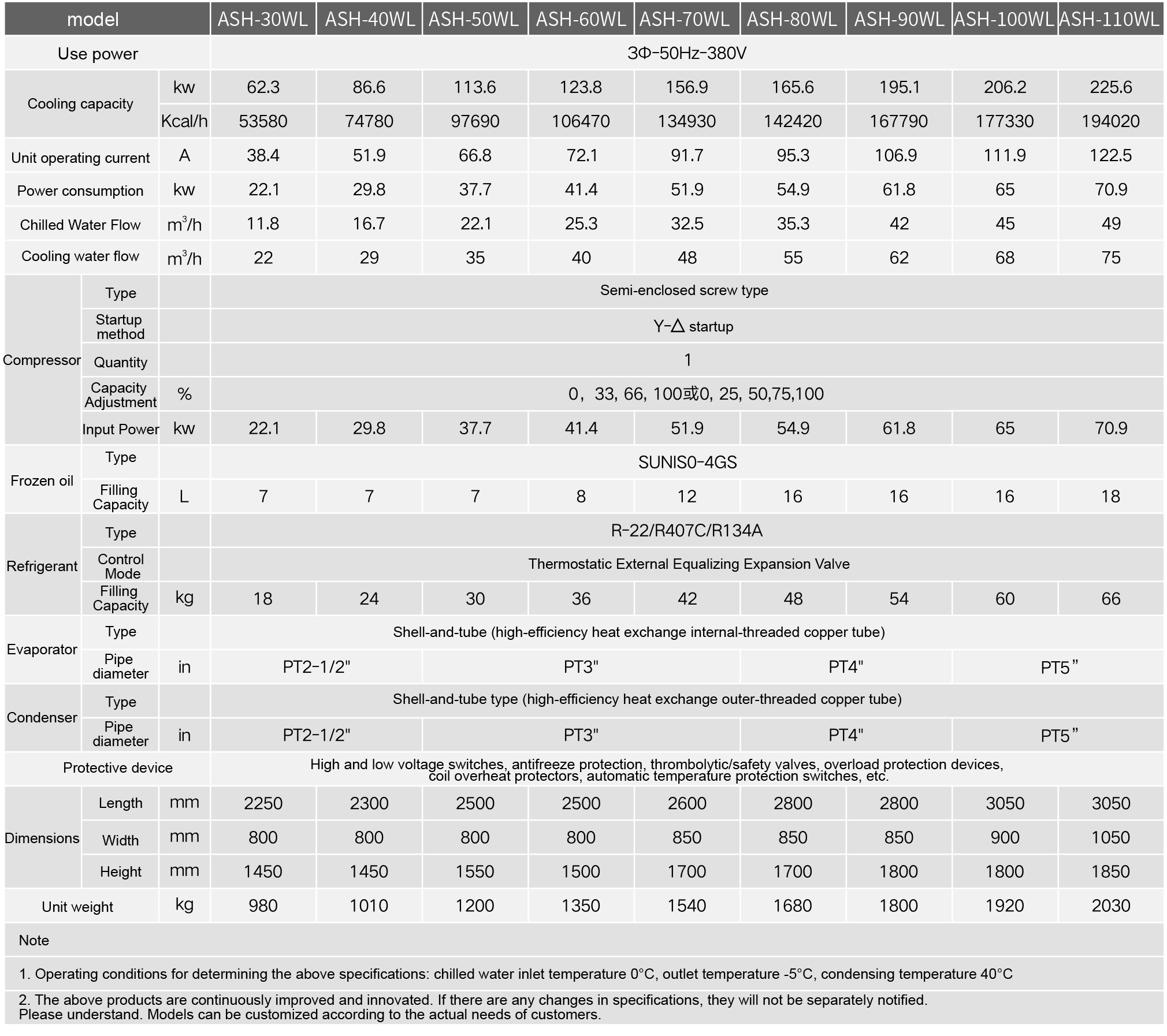 The ASH-W series water-cooled low-temperature industrial chillers are anew generation of low-temperature refrigeration equipment meticulouslydeveloped and designed for special industries such as pharmaceuticalsand chemicals. Their cooling temperatures can be adjusted freelybetween -5°C and 40°C. Small-capacity models use fully enclosedcompressors from well-known European and American brands, whilelarge-capacity models use screw compressors from internationallyrenowned brands (Taiwan Hanbell, Bitzer), providing ample coolingperformance and a full range of specifications, making it a model of thenew generation of refrigeration equipment.