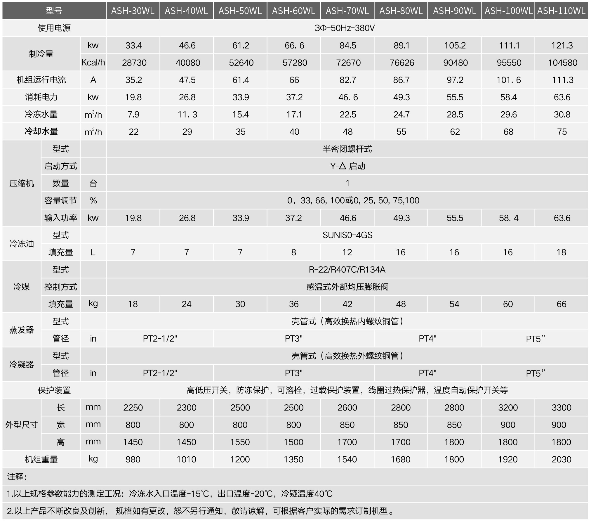 ASH-WL系列水冷低温式工业冷水机是针对医药、化工等特殊行业而精心研发设计的新-代低温冷冻设备,其制冷温度可在-20°C~40°C之间任意调节。小匹数机型采用欧美进口知名品牌的全封闭压缩机;大匹数机型采用国际知名品牌(台湾汉钟、比泽尔)螺杆压缩机,制冷效果充足、规格齐全,是新一代制冷设备的典范。